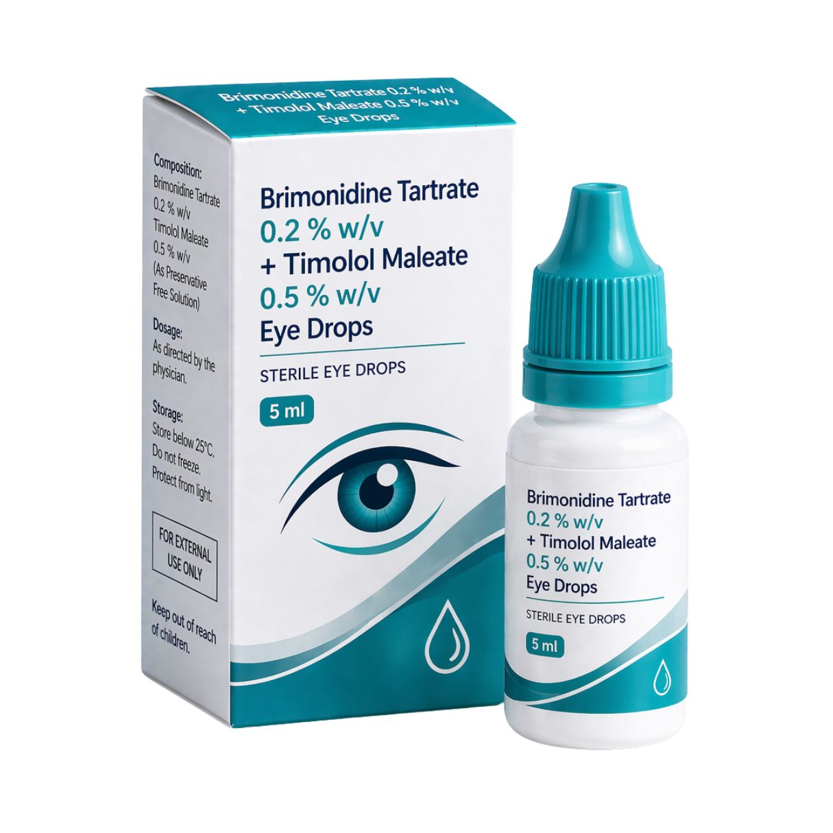Brimonidine tartrate 0.2% w/v + Timolol Maleate 0.5% w/v Eye Drops lower elevated intraocular pressure in patients with open-angle glaucoma and ocular hypertension. Brimonidine decreases aqueous humor production and improves its outflow, while Timolol further reduces fluid formation; therefore, this combination effectively controls eye pressure and helps protect vision. Additionally, it supports long-term optic nerve health and reduces the risk of progressive vision loss with regular use.