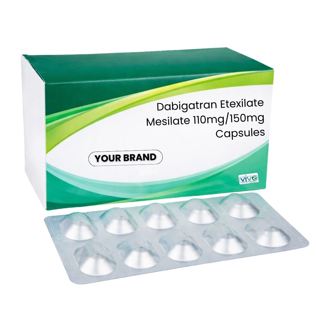 Dabigatran Etexilate Mesilate 110/150mg Capsules are oral anticoagulants used to help prevent and manage blood clots. They act by directly blocking thrombin, an essential enzyme in the blood clotting pathway, thereby reducing the risk of stroke and other thromboembolic events.