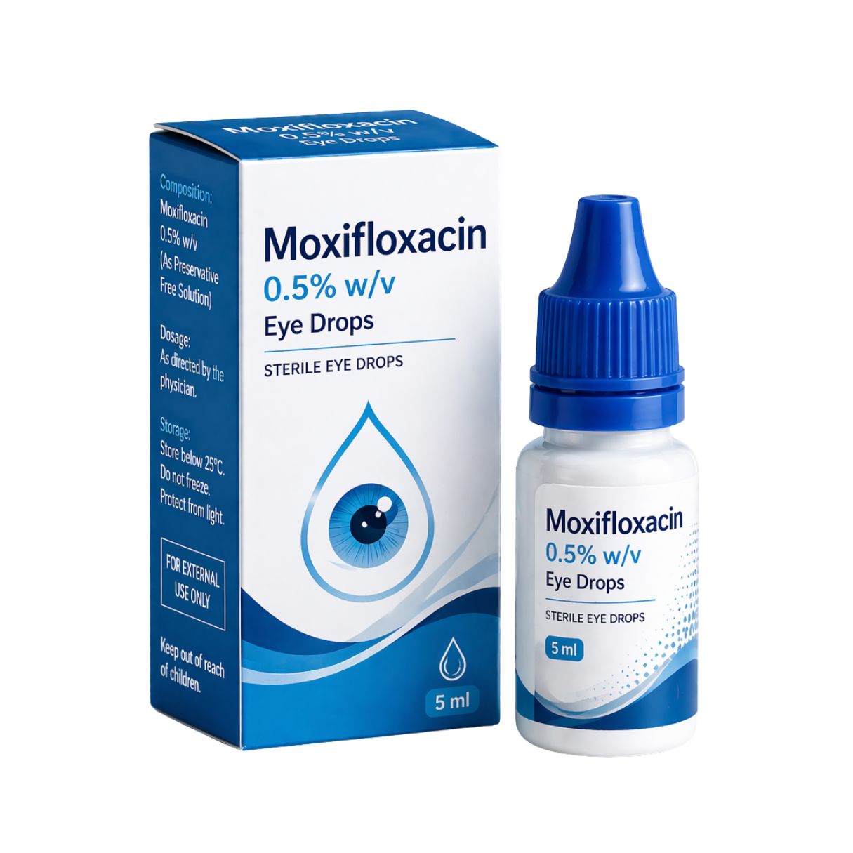 Moxifloxacin 0.5% w/v eye drops treat bacterial eye infections such as conjunctivitis (pink eye), keratitis, and corneal ulcers. As a fourth-generation fluoroquinolone antibiotic, it actively kills infection-causing bacteria; therefore, it reduces symptoms like redness, itching, pain, swelling, and discharge. Additionally, it promotes faster recovery and helps maintain overall ocular health.